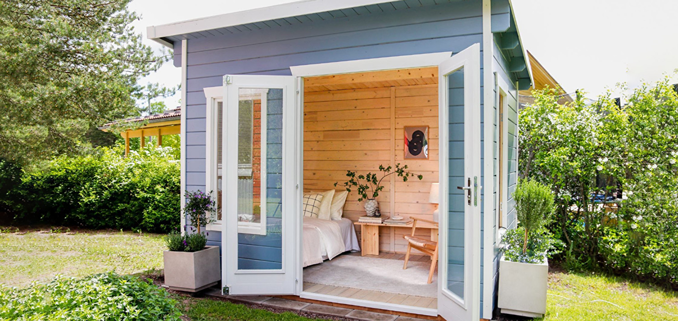 Deze tuinblokhut is aan de buitenkant geverfd met Vinha, een dekkende houtverf in de kleur TVT Q451, een eenvoudig maar levendig blauw met een vleugje grijs. De witte raamkozijnen in de kleur TVT Q818 Tiira accentueren de lichte en serene stijl.