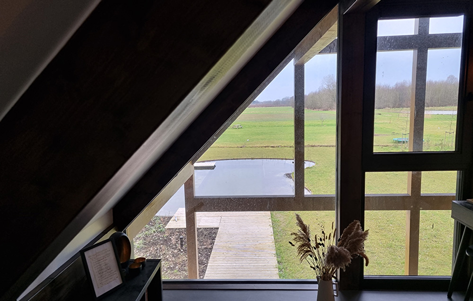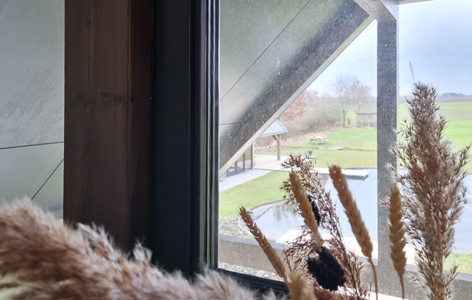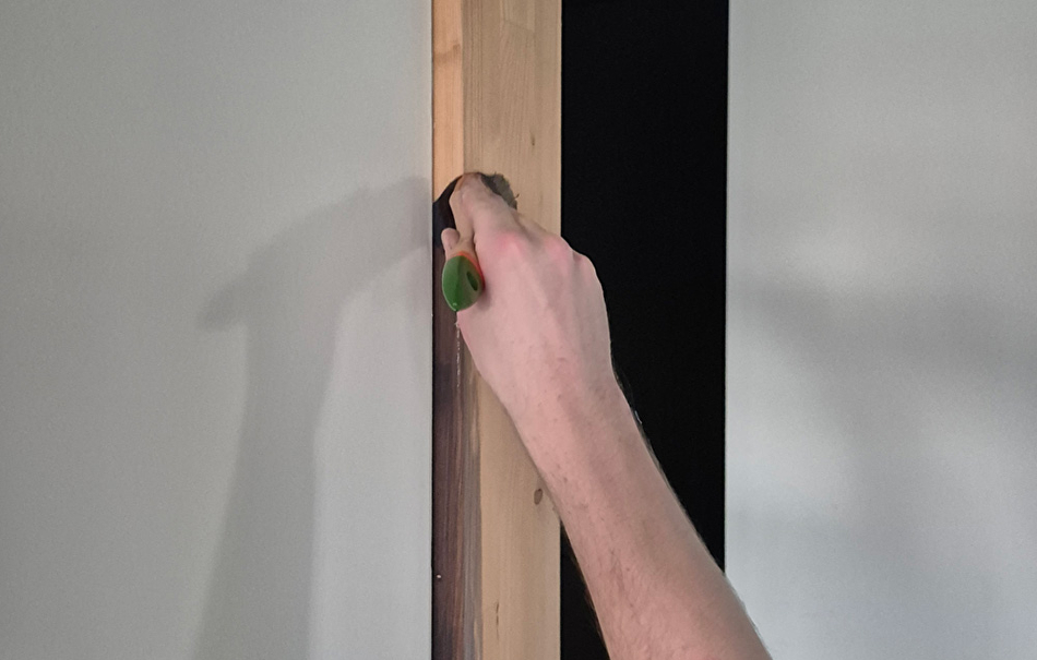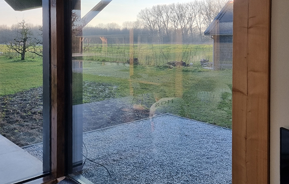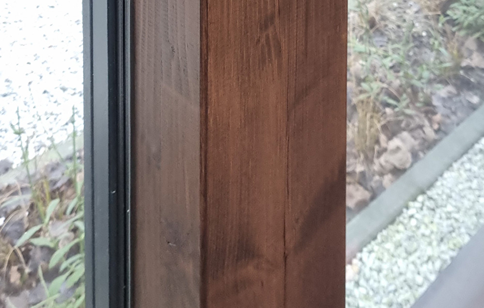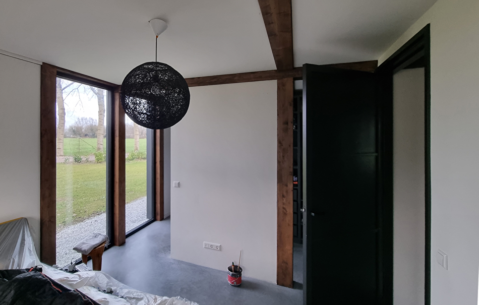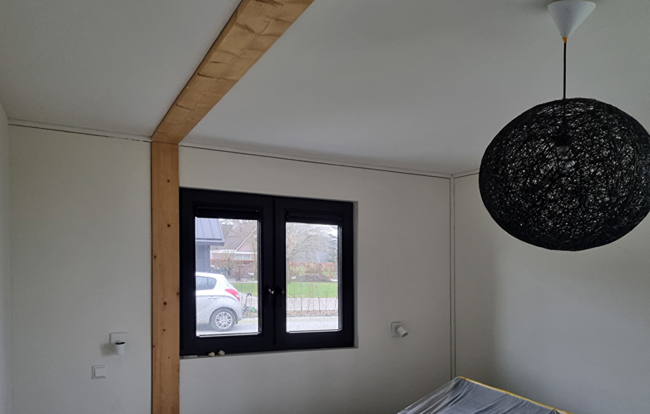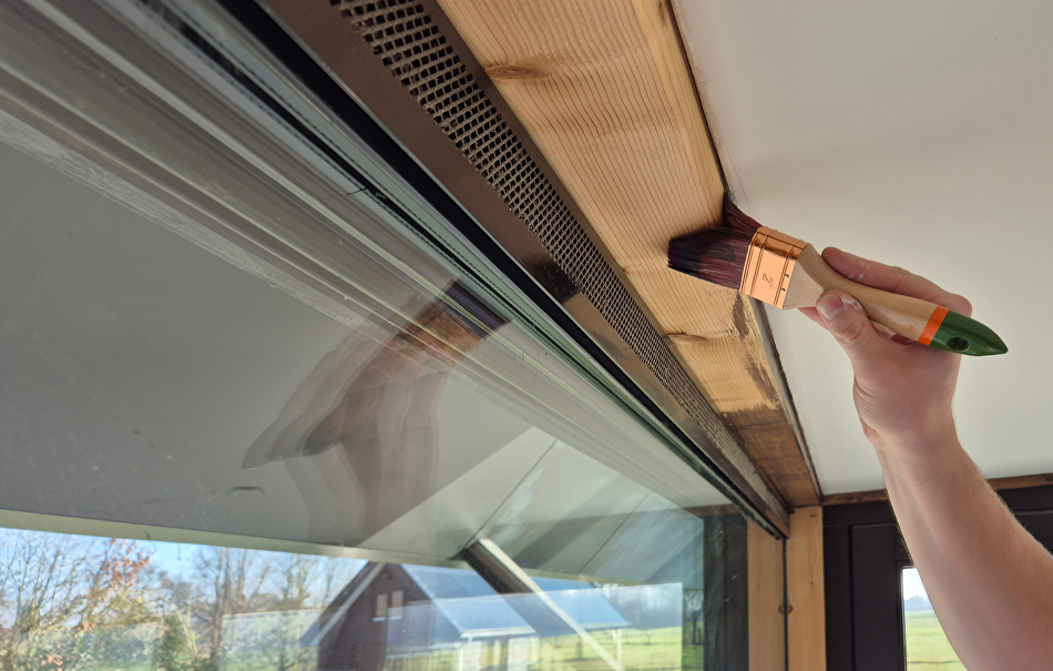 We beginnen met schoonmaken, waar nodig wordt het hout afgenomen met een vochtige doek. Enkele gedeeltes van het houtoppervlak die wat groffer zijn worden wat bijgeschuurd. Het merendeel is onaangetast gebleven om zo de charme van het hout te bewaren. Dan wordt het Paal en Balksysteem overal twee keer behandeld met Paneeli Assa 10.