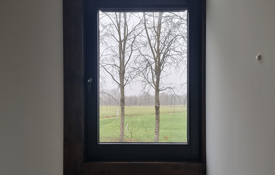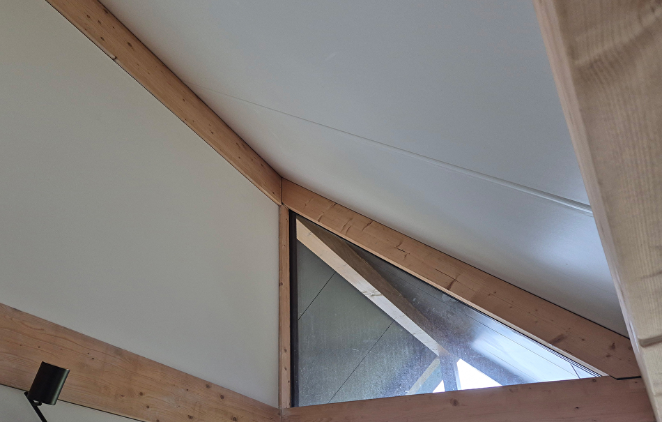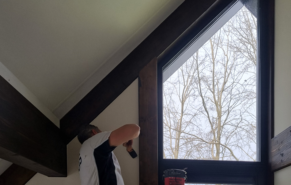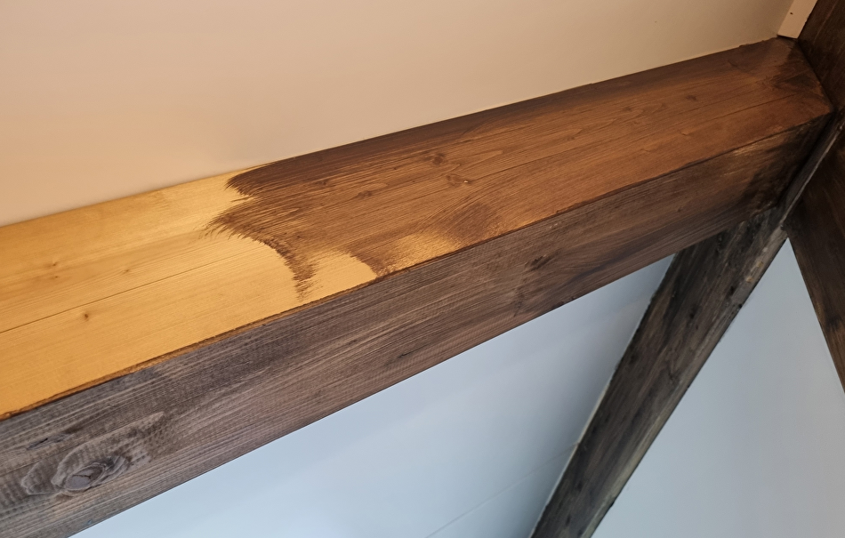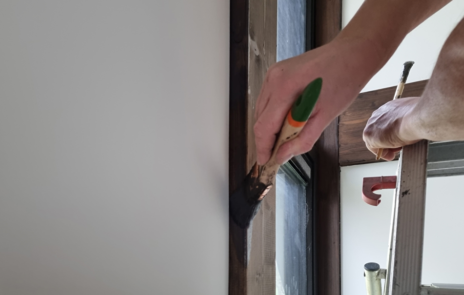 Nadat de Finnpaints schilders vorig jaar de buitenkant onder handen hebben genomen is nu de binnenkant aan de beurt. De eigenaar vond het lastig om een kleur te kiezen voor de balken. Op een plank die over was zijn meerdere proefstukjes opgezet, van whitewash tot donkerbruin. De keuze is gevallen op de donkerbruine kleur TVT 218A vanwege de warme, chique uitstraling.