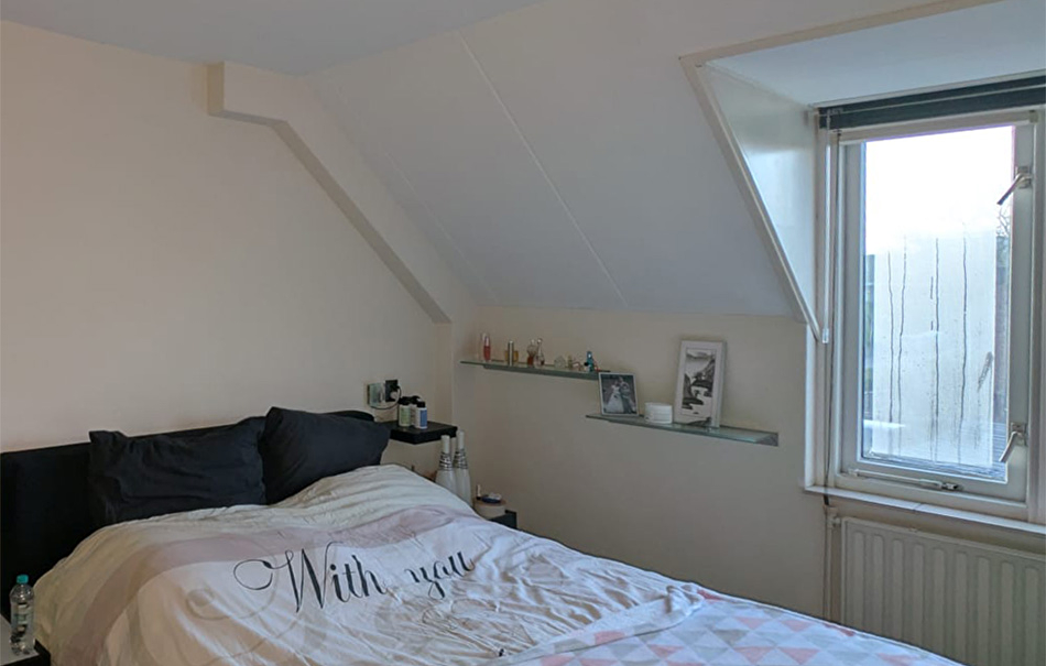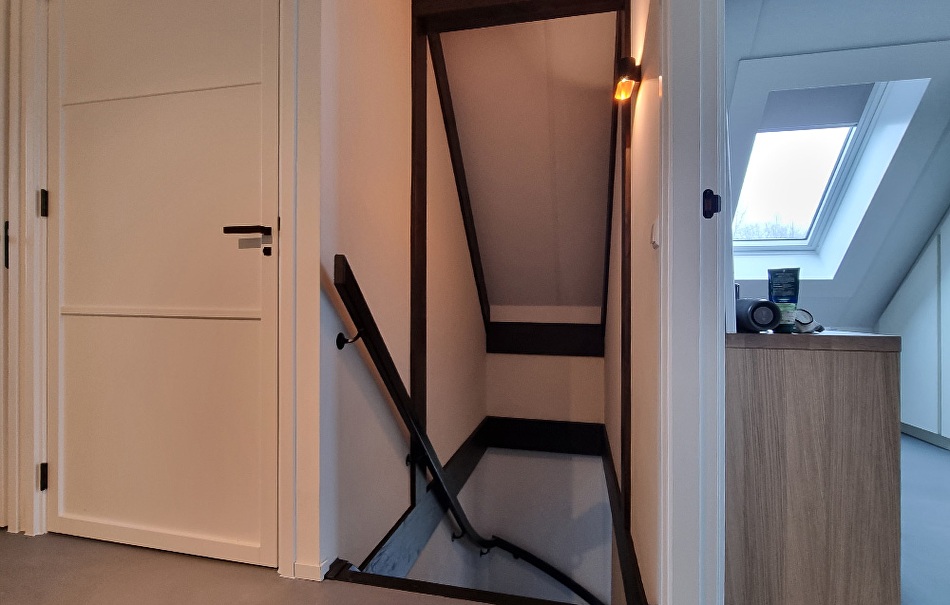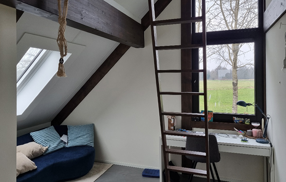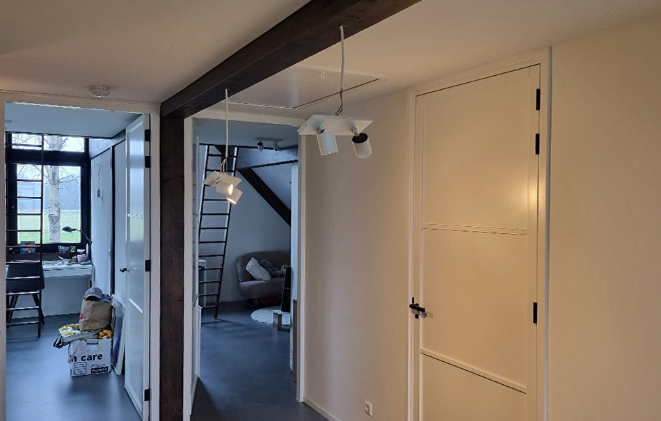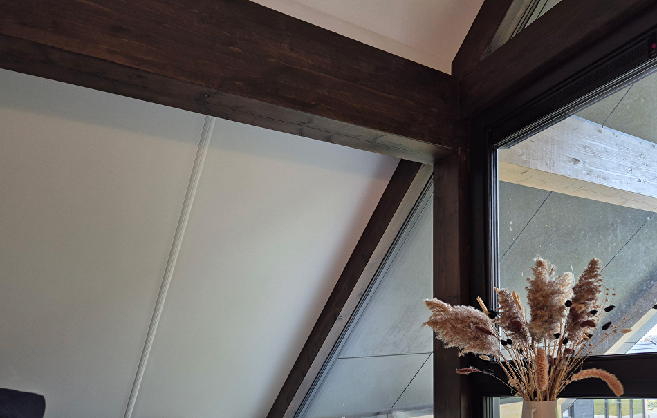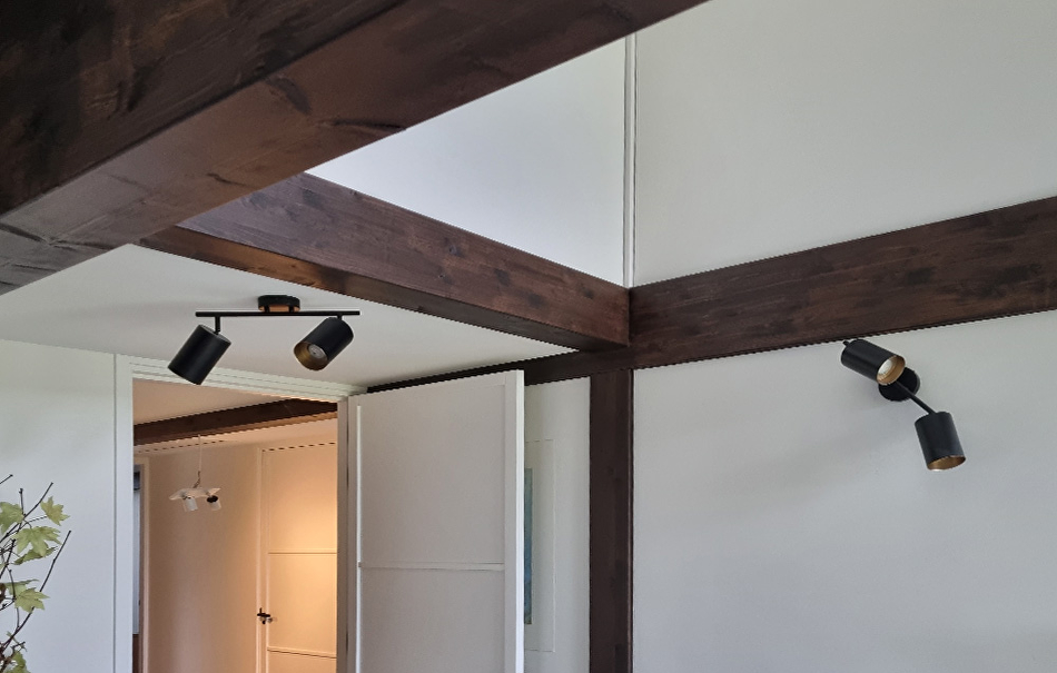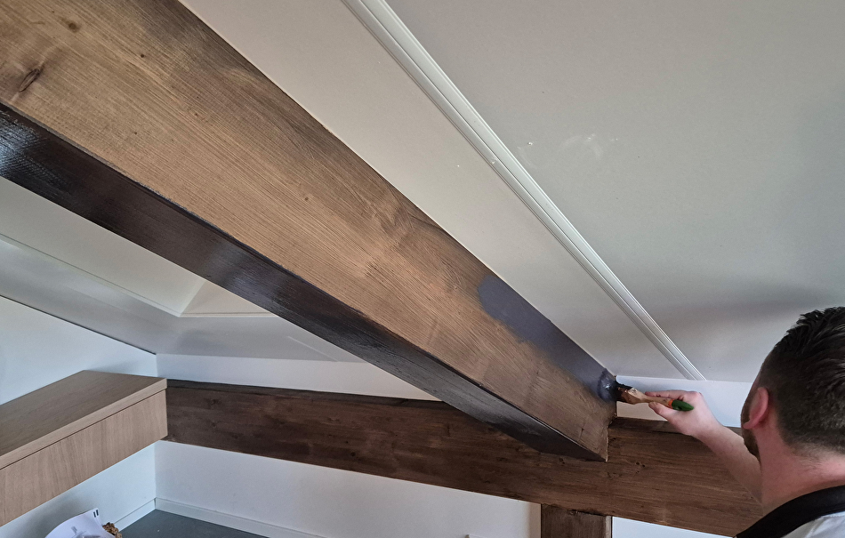 Als we de paneellak twee keer zouden aanbrengen in de kleur TVT 218A dan zou het eindresultaat te donker worden. Daarom hebben onze schilders de donkerbruine paneellak 50-50% vermengd met kleurloze, transparante paneellak. De balken in het plafond zijn wit (RAL 9010) geschilderd met Futura Aqua20 in dezelfde kleur als het plafond, zodat de ruimte veel opener en ruimer oogt.