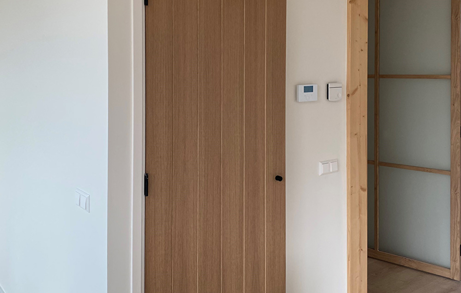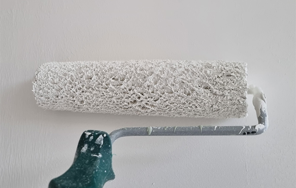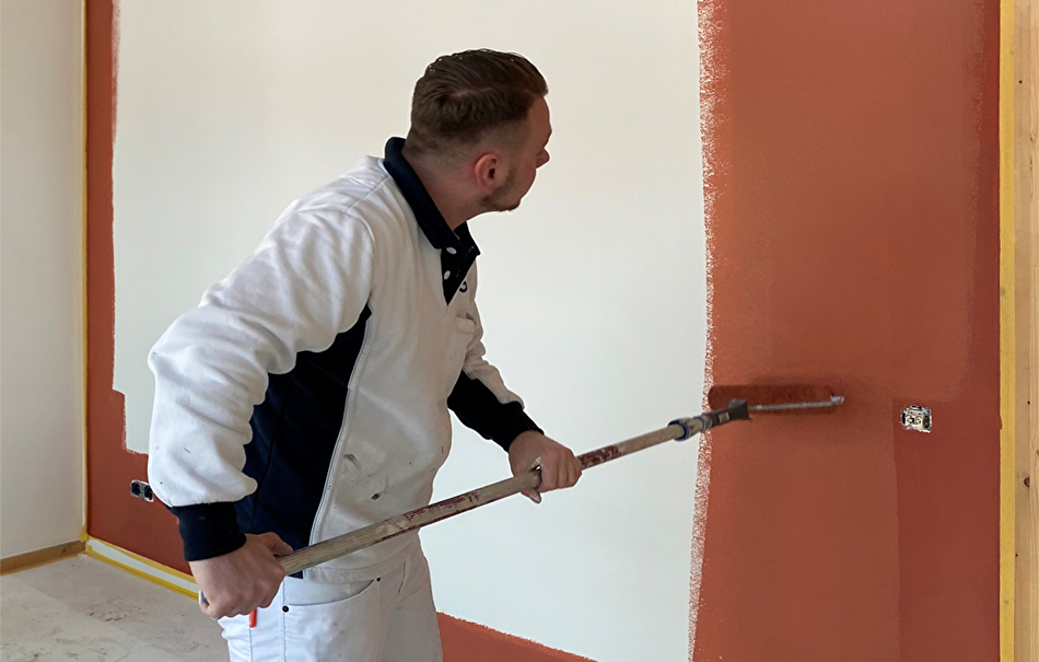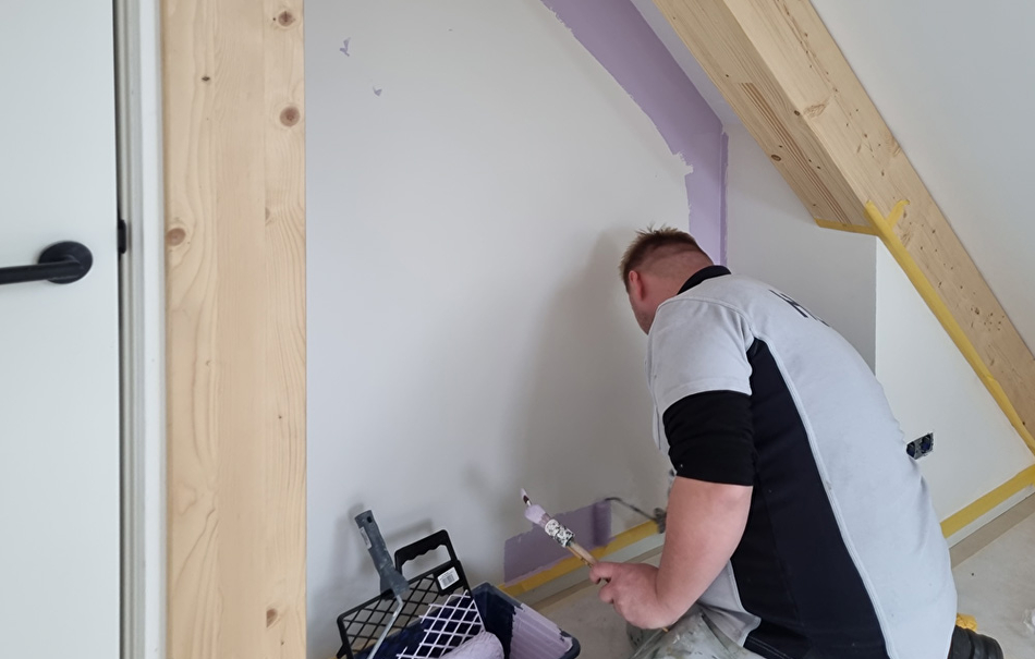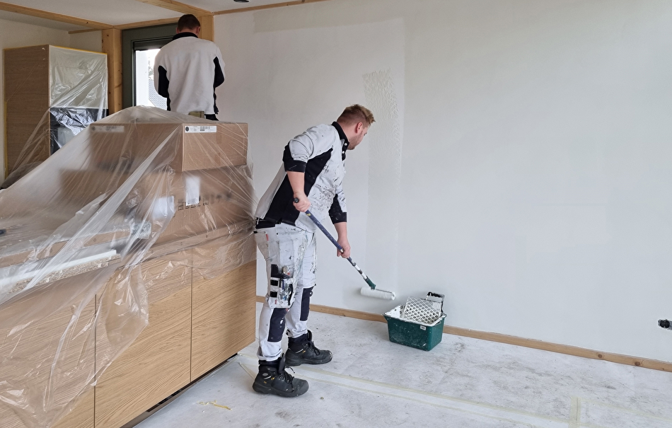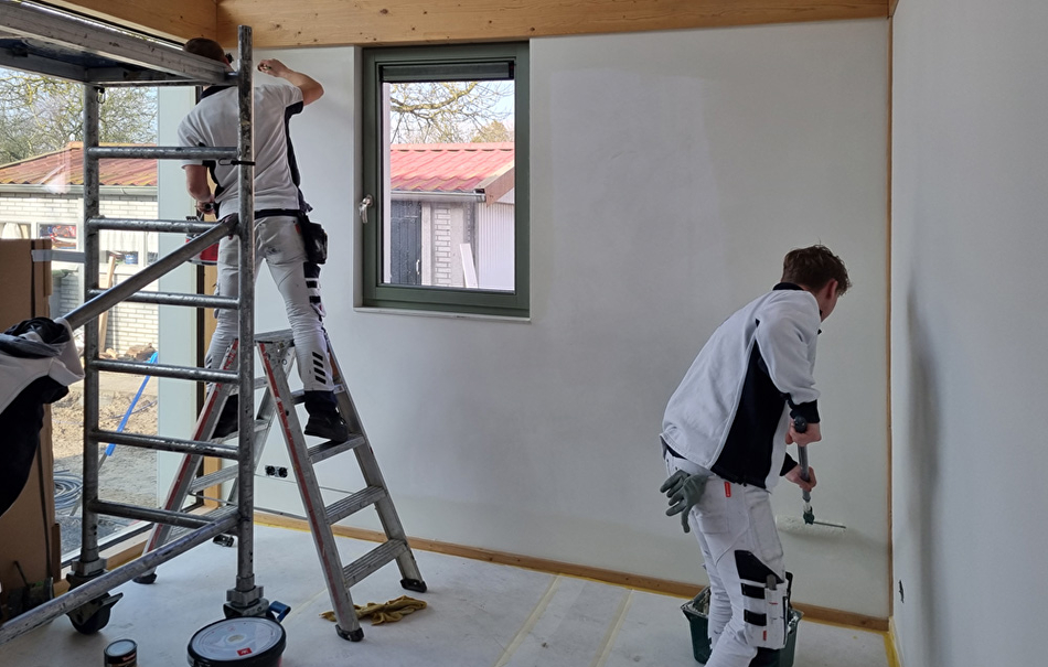 Ramen en kozijnen worden geschilderd met de zijdematte Teknos Futura Aqua 20 in de kleuren RAL 7033 en RAL 9010. De muren en plafonds worden eerst voorbehandeld met Varma Primer om de zuigkracht van het nieuwe stucwerk te verminderen. Daarna worden ze geschilderd met Feelings Interior Paint in de kleur RAL 9010. Voor ruimtes waar het vochtig kan worden gebruiken we Luja 7 omdat deze een schimmelwerend component bevat.