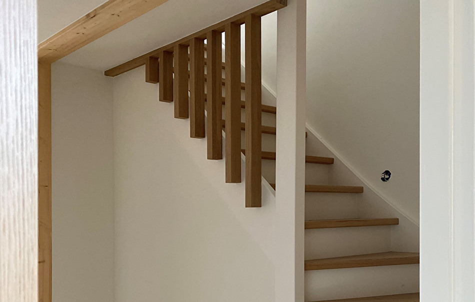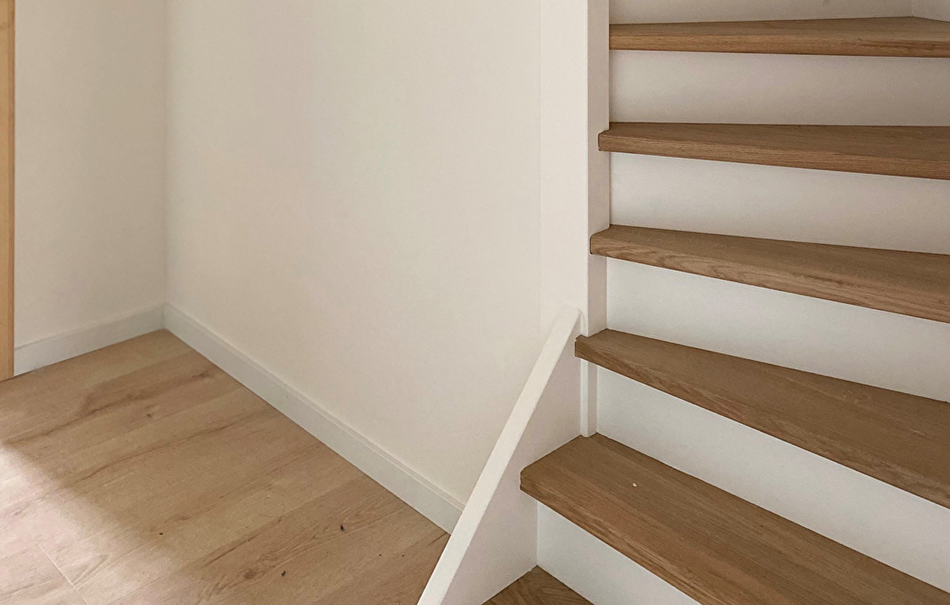De trap wordt geschilderd in twee kleuren; de traptreden behouden hun houtkleur en worden geschilderd in de kleurloze Paneeli Assa, daarna worden ze afgelakt met parketlak als bescherming tegen krassen. Stootborden worden wit RAL 9010.