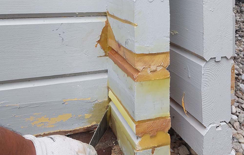 Net na de zomer gaan onze schilders aan de slag! Eerst alles goed schoonmaken met Maalipesu, zachte en harde borstels en daarna royaal afspelen met water. De loszittende verf wordt machinaal geschuurd en de benodigde houtreparaties worden vakkundig uitgevoerd. Als dit gedaan is kan het echte schilderen beginnen. De logs, schijnlogs, boeidelen en overstekken worden 2 x geschilderd met Tikkurila Vinha. De kozijnen, ramen en deuren worden 2 x geschilderd met Tikkurila Unica Akva. Met behulp van onze kleurtesters en inspiratie van onze projecten pagina hebben de eigenaren de kleuren TVT Q841 en TVT F497 uitgezocht. Ook de buitenkeuken mag geschilderd worden. Deze willen ze er graag uit laten springen en daarom wordt er voor een lichtgroene tint, TVT Q574 gekozen.