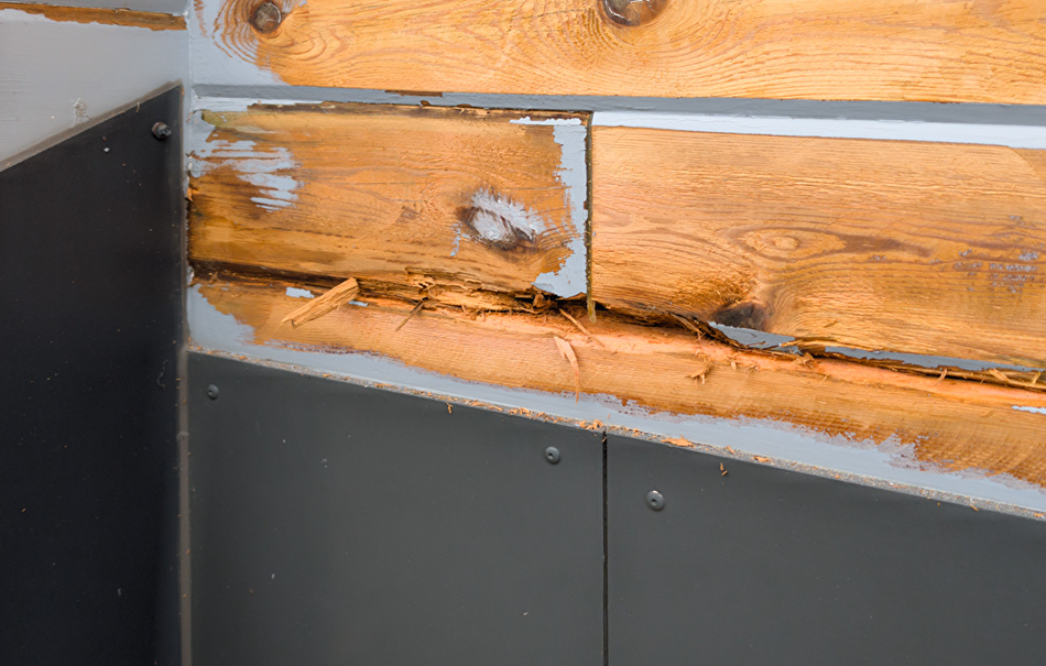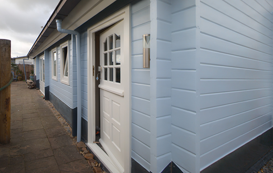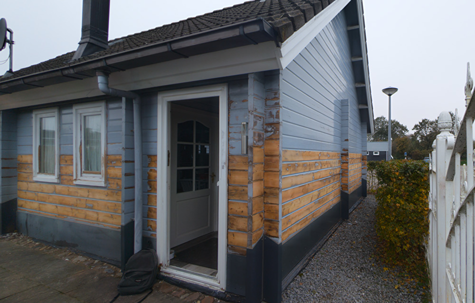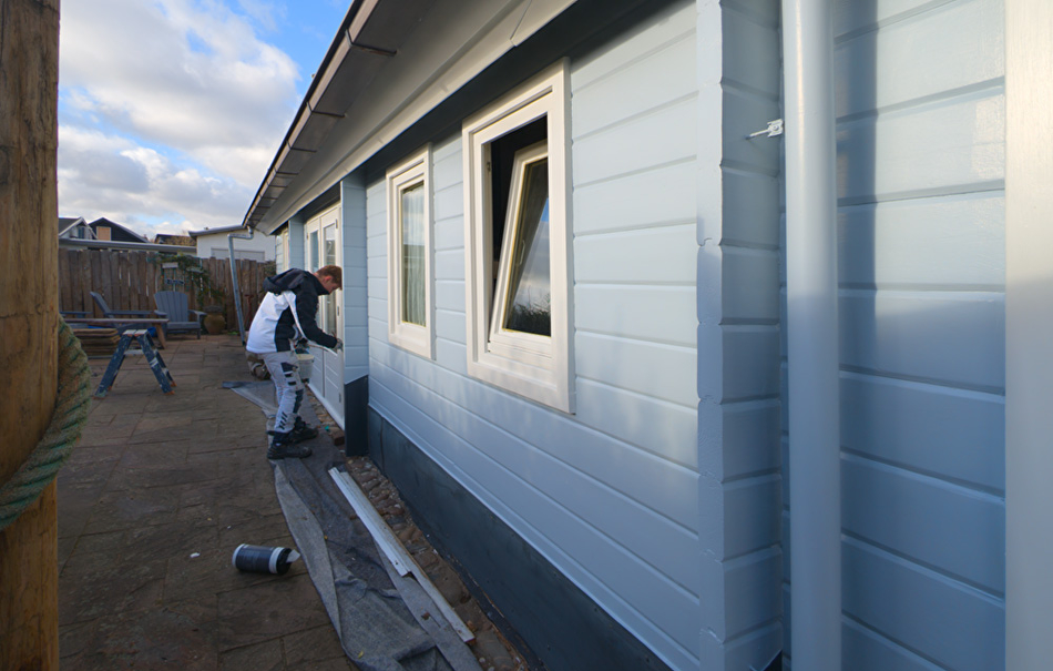 In het naseizoen reizen de mannen van Finnpaints af naar Ouddorp om de klus te klaren. Als eerste wordt de woning volledig schoongemaakt met Maalipesu, water en borstels. Daarna wordt alles goed afgespoeld. Na droging van het hout schuren we de onderste logs zoveel als redelijk mogelijk kaal. Hierdoor kan het teveel aan vocht eruit. Ook wordt het houtrot stap voor stap aangepakt.