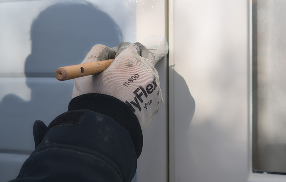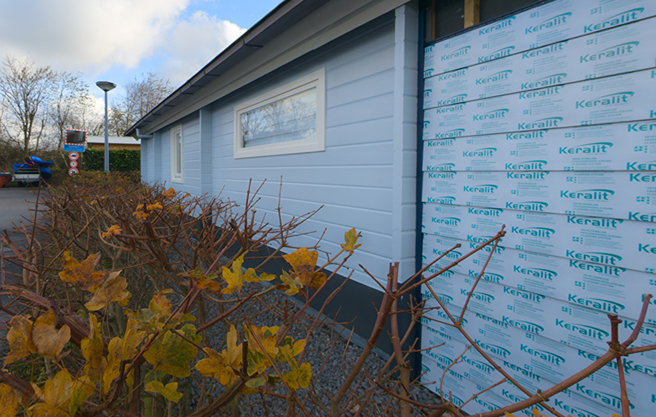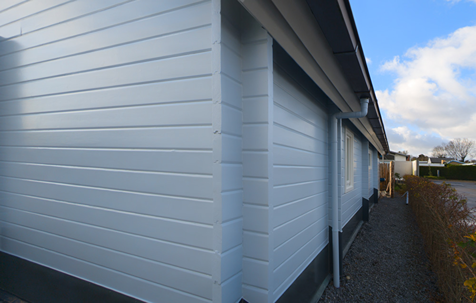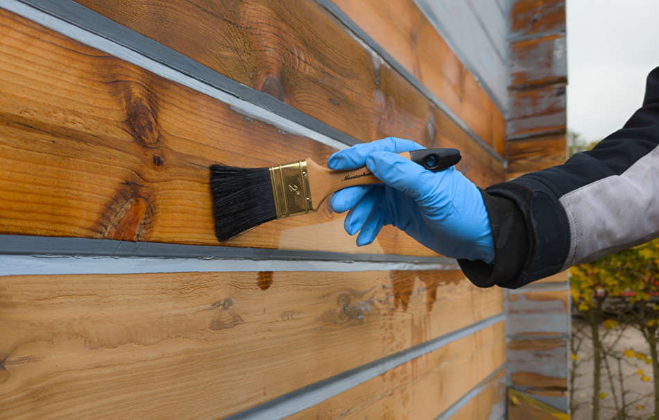 De geschuurde logs worden voorzien van een laag Valtti Primer, een kleurloze primer olie die het indringen van vocht vertraagt en verspreiding van schimmel voorkomt. Tot slot worden alle geveldelen tweemaal geschilderd met Vinha in de kleur TVT Q420 en de deuren en kozijnen met Unica Akva in de kleur RAL 9010.