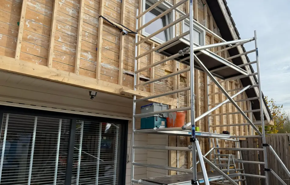 Na het kaal schuren van de gevel is het stijl- en regelwerk aangebracht, waar nodig versterkt met extra balken. Daarna zijn de op maat gemaakte schijnlogs gemonteerd. Deze hadden we rondom laten spuiten bij een van onze vaste partners. Ook werden boeidelen aangepakt, oortjes hier en daar hersteld.