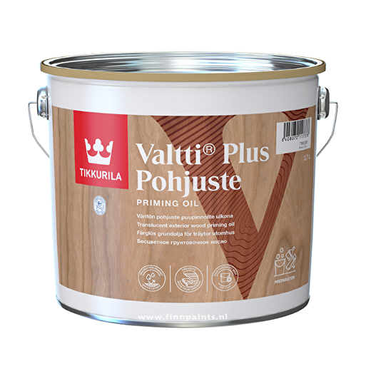De kleurloze Valtti Plus Pohjuste wordt gebruikt om houten oppervlakken buitenshuis te beschermen. Dringt gemakkelijk door in de houtvezels en biedt een zeer goede bescherming tegen waterabsorptie, zelfs op voegen en kopshout. Vermindert het risico op barsten in hout- en verflagen. Hoge duurzaamheid in combinatie met Tikkurila buitenbeits of -verf.